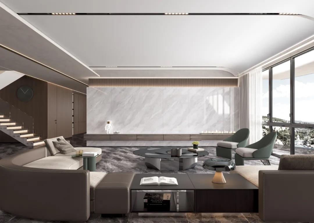纹理细腻的流沙彩虹与森林色系的软装进行碰撞,营造静谧悠然的自然气息,丛林的纯粹之感呼之欲出。