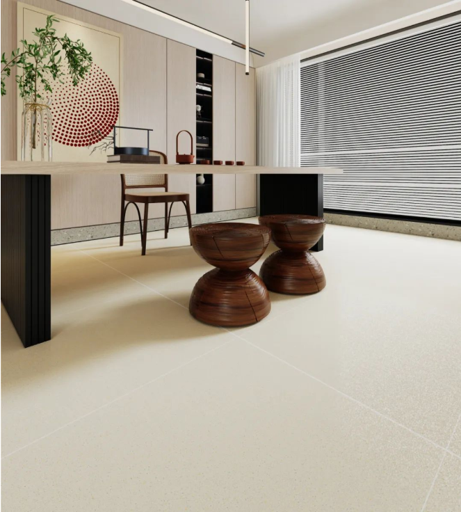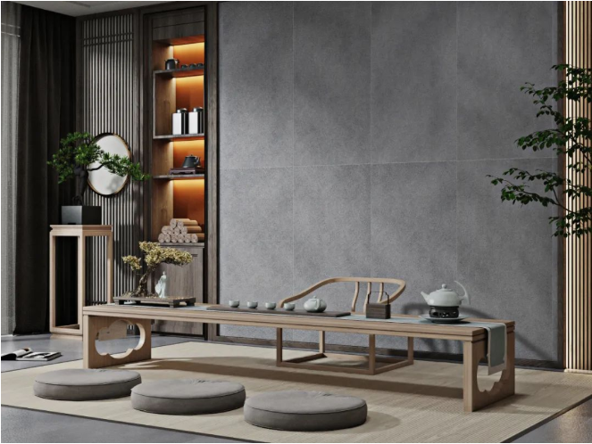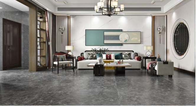 以【DCSS715RP05A秋夜雨】作为地面装饰,深灰与细丝白纹的搭配,宛如水墨画般韵味十足,流露出儒雅而宁静的空间氛围感。