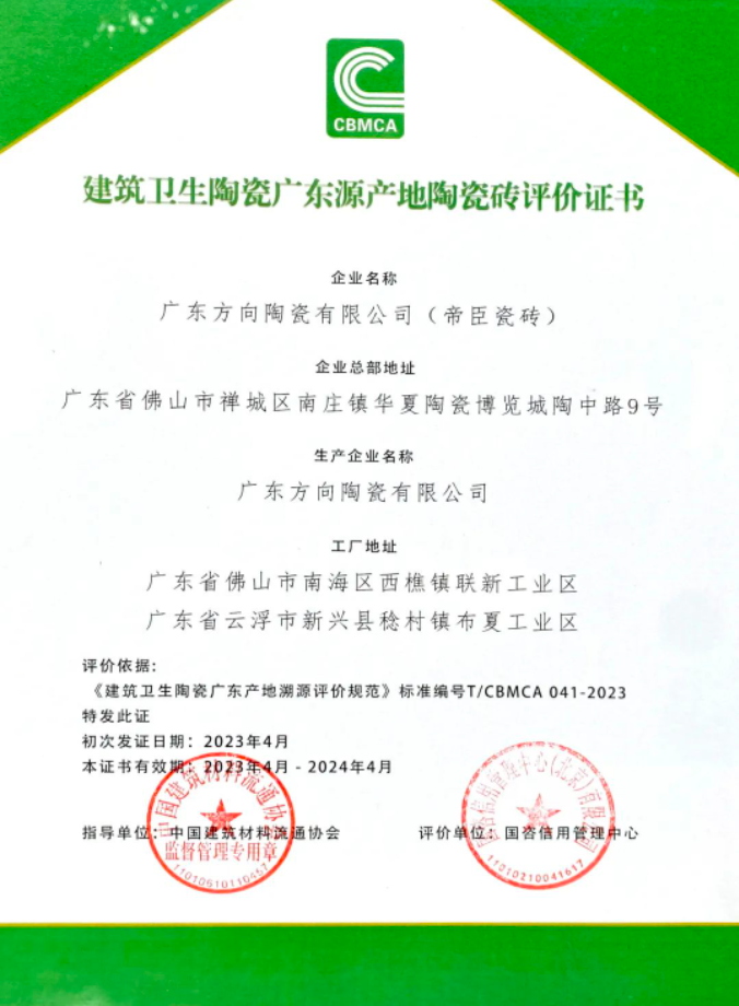 ▲建筑卫生陶瓷广东源产地陶瓷砖评价证书